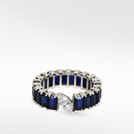 This exquisite tennis ring is designed to captivate a portrait set blue sapphire in fancy emerald cut. Enhancing its modern allure, a striking offset marquise-cut lab-grown diamond disrupts tradition, transforming it into a truly unique piece.