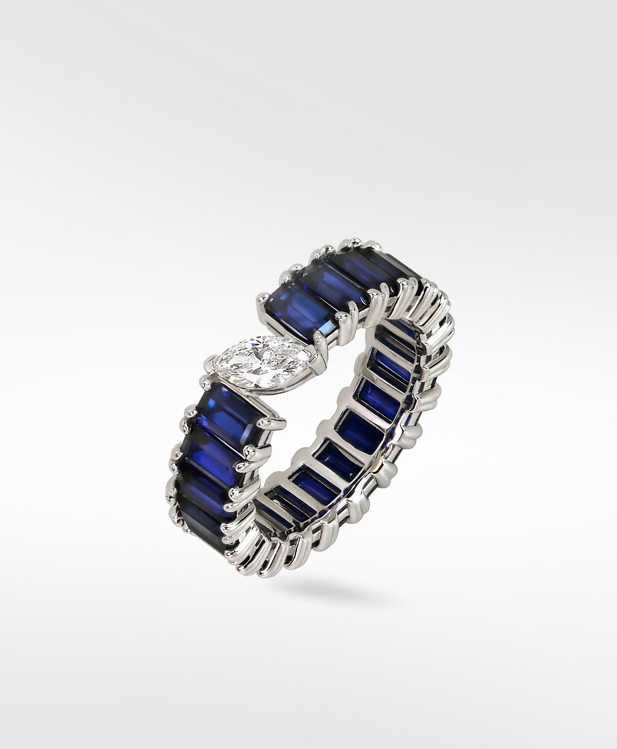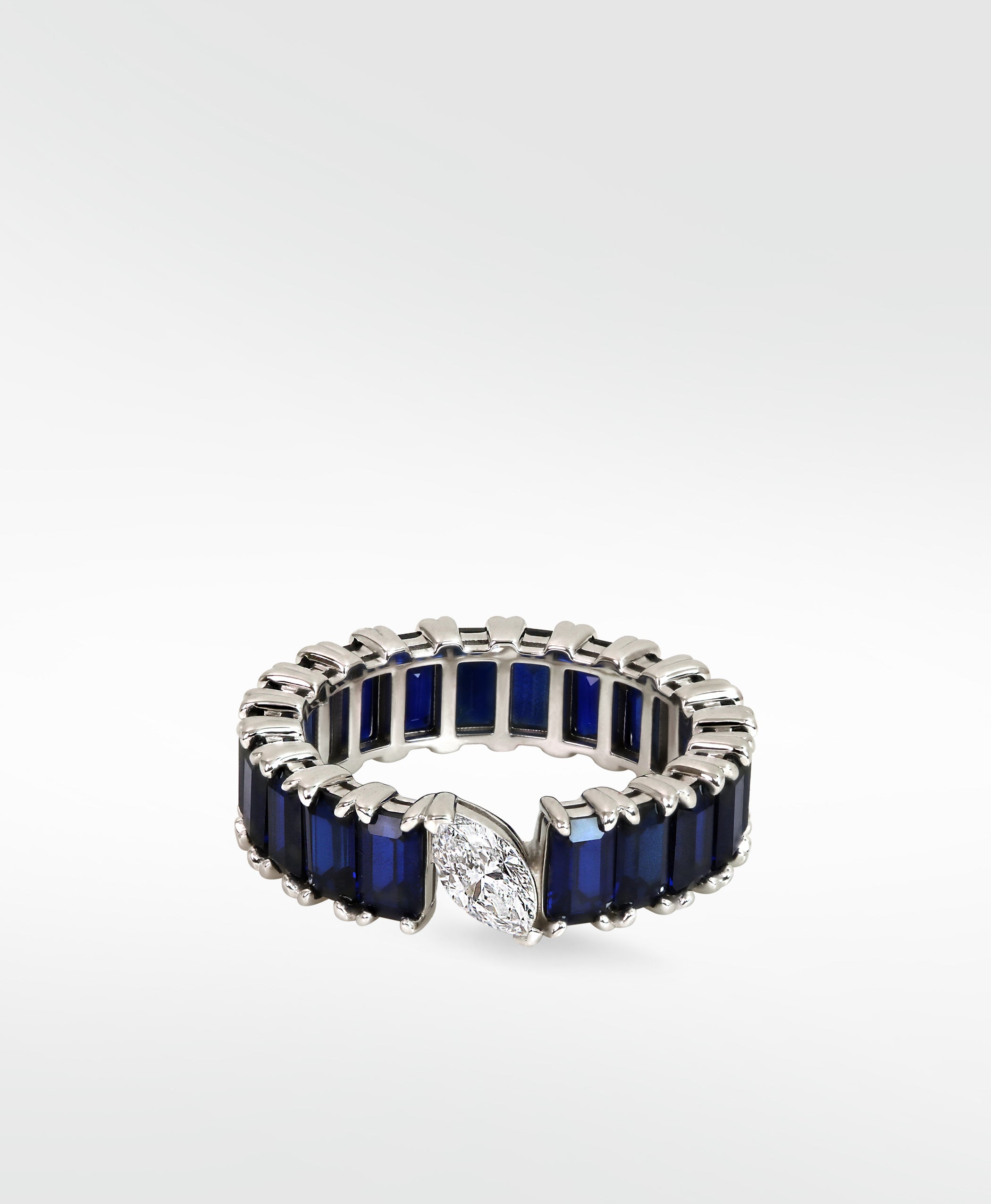 • The blue sapphire Veto Lux eternity ring featuring a marquise-cut diamond is the epitome of modern sophistication and timeless elegance. It's sleek, elongated shape adds a touch of contemporary flair, while the rich blue sapphires create a stunning contrast against the brilliance of the diamond. Easy to stack and wear to any outting.